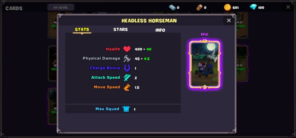 S-Tier cards – Headless HorsemanAs stated before, card rarity doesn’t mean anything in this game, Headless horseman is just an epic card and there are legendary cards in the game too, but Headless Horseman with 400 damage per strike and with an attack speed of 2 means the character have the best combination of damage and mobility in the game.