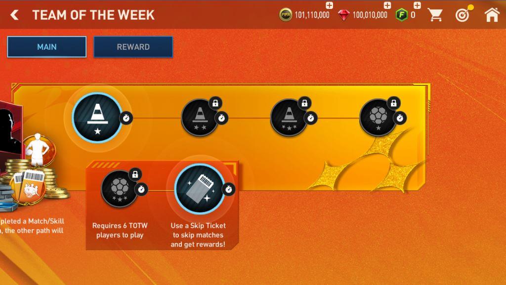 There are also 2 additional ads every day that you need to watch. Play Skill Games and Matches in TOTW every week for TOTW Points. You have the choice between 2 paths: Top Path and Bottom Path. Once you choose to play one of the paths, the other becomes locked. Skip Tickets can be obtained with TOTW Points if you want to skip the match play and quickly receive your rewards.